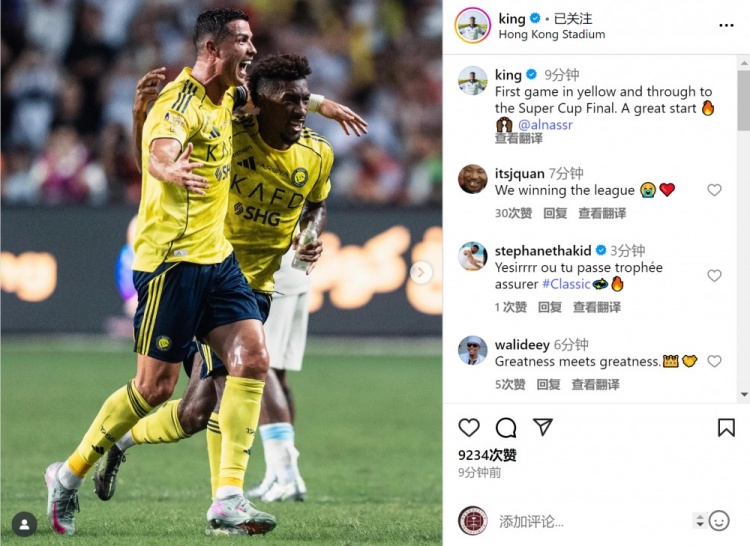科曼社媒晒出与C罗一起庆祝的照片,配文:“身披黄色战袍的首场赛事 ,晋级下一轮 沙超杯总决赛 足球投注安全网站,很棒的开始!”