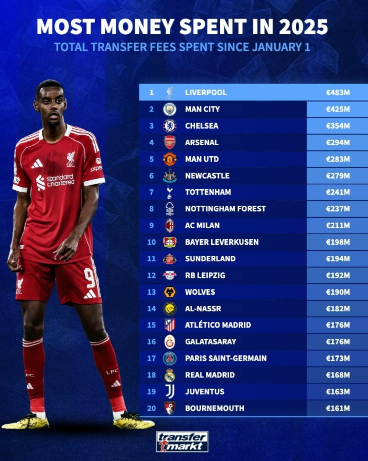 2025年俱乐部转会费支出榜:利物浦4.83亿欧居首,前8均来自英超
