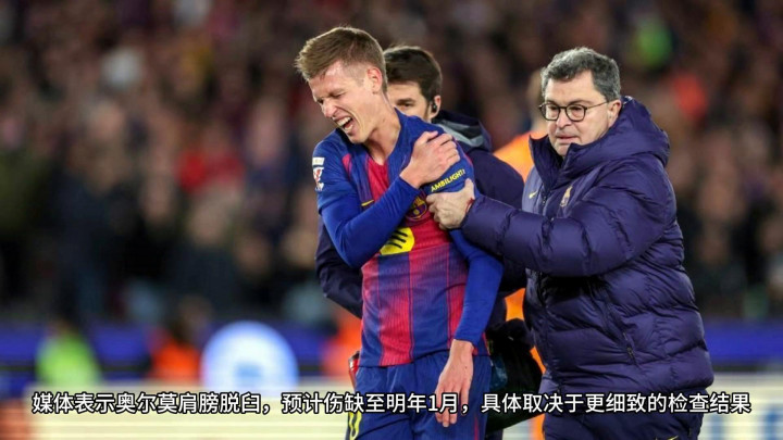 ·再伤!巴萨中场球员奥尔莫在击败马竞的赛事 中肩膀着地,肩部负伤 被换下。媒体表示奥尔莫肩膀关节脱位 ,预计伤缺至明年1月,具体取决于更细致的检查结果。