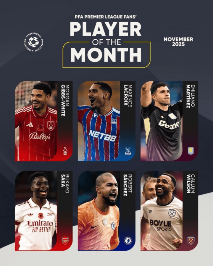PFA英超11月最佳球员候选: 萨卡、大马丁、桑切斯在列
