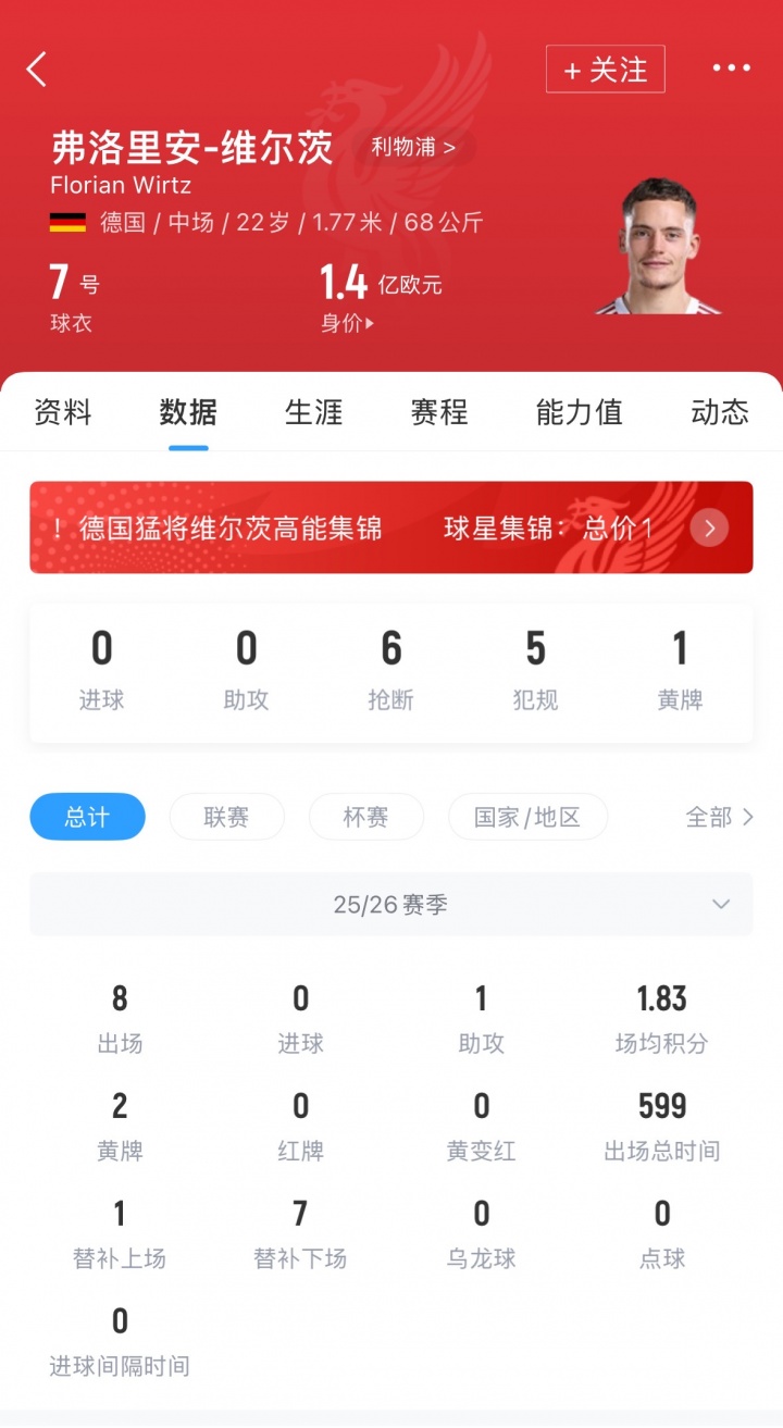 09月29日讯 知名转会记者罗马诺更新个人youtube频道,谈到了近期维尔茨的表现以及利物浦对球员的看法,表示红军仍然对维尔茨抱有信心。