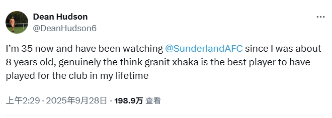 英超升班马桑德兰本赛季开局表现出色, 6轮仅1负目前排名前5。球队新援、领队 扎卡的出色表现引发了一位27年桑德兰本土老球迷的赞叹。