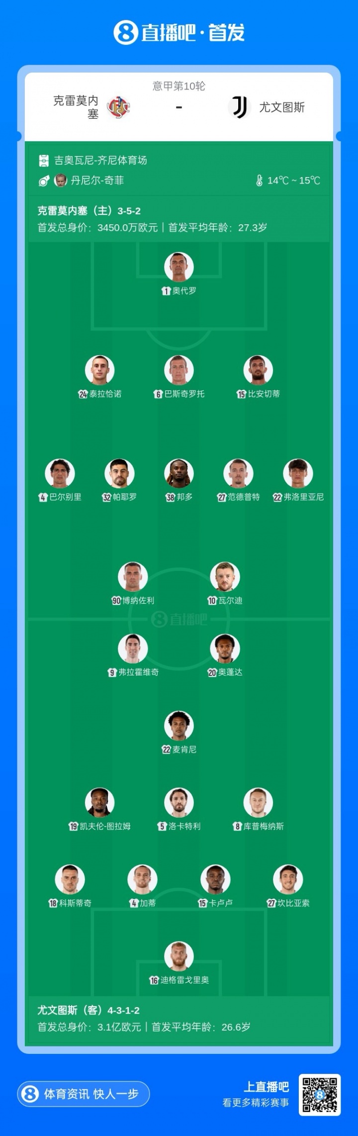 11月2日讯 意甲第10轮,欧洲杯直播吧克雷莫内塞主场作战 迎战尤文赛事 即将打响。赛前杆位出炉。